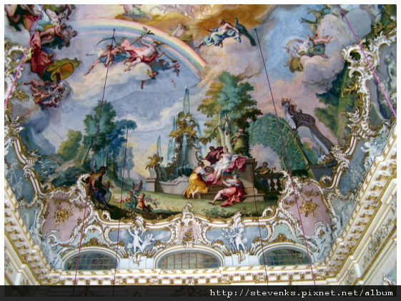 依參觀指示上到二樓,首先是位在整層樓正中央的steinerner saal(英文: stone hall),天花板上的超大壁畫(ceiling fresco)加上許多繁複的雕飾邊框是這個廳最大的特色,看來所謂的巴洛克不在其外而在其內。西方國度的壁畫內容大約不脫希臘神話的典故,此宮亦然,在這幅巨大的天花板壁畫中據說是描述所謂掌管春天,花朵,自然山林等的仙子與其他神祉的圖案,而這些仙子的德文原文即是Nymph,直接將此宮的名稱巧妙的嵌入畫中,有”藝”思。