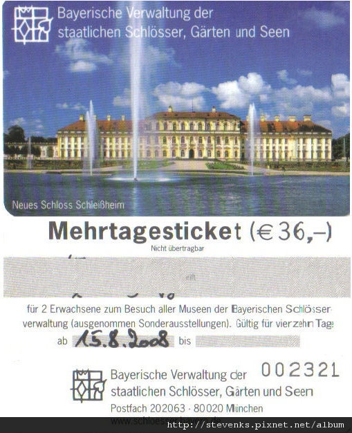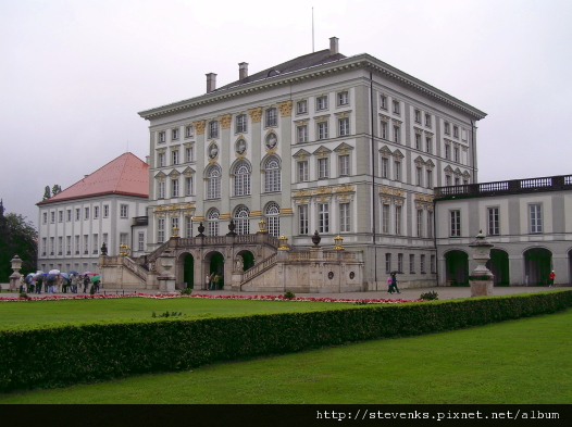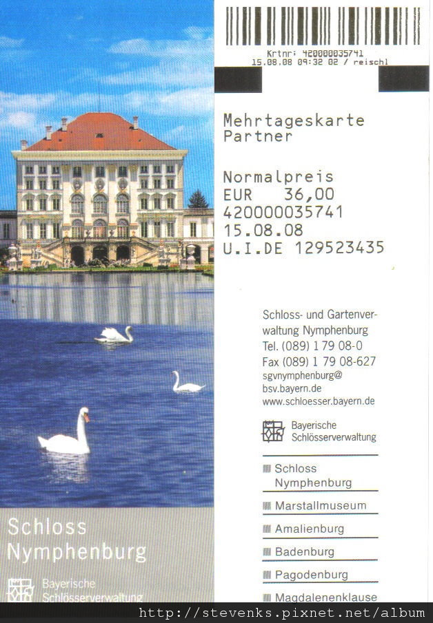 白色為基底的牆壁搭配紅色的屋瓦,寧芬堡建築物的外觀相當簡樸,實在跟我所認知的應該有著繁複雕刻華麗裝飾的所謂巴洛克型式的建築有很大的落差。我們買了一張14日的家庭號巴伐利亞宮殿卷,有這張pass ( 36 euro) 可以在兩個星期之內進入拜楊邦境內40餘大小宮殿,博物館,絕對划算。